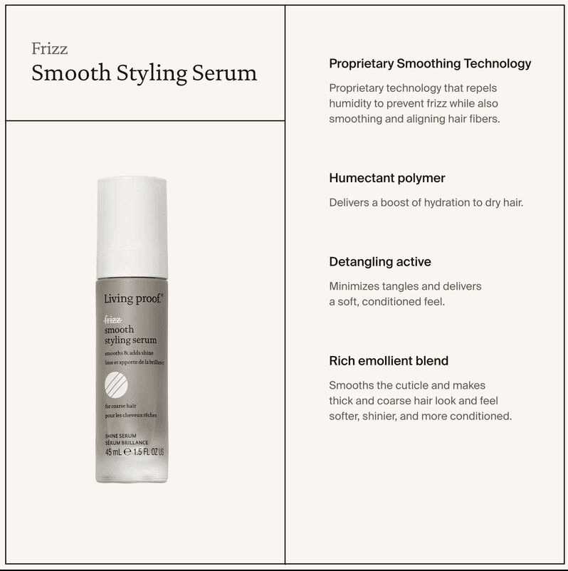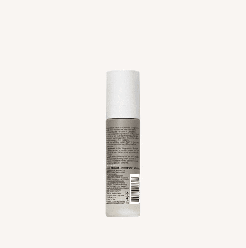 45 mL – Smooths and adds shine. A concentrated, silicone-free anti-frizz serum specifically formulated for thick or coarse hair that provides a smooth blowout in half the time while adding softness and shine.
